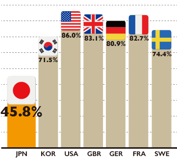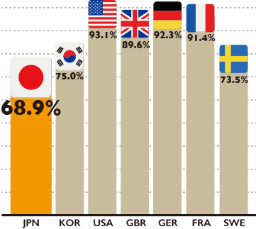 日本を含めた7カ国の満13~29歳の若者を対象とした意識調査(内閣府「我が国と諸外国の若者の意識に関する調査(平成25年度)」)によると、「自分自身に満足している」という人は日本人全体で45.8%と、半数を下回る結果になっています。また、「自分には長所がある」と答えた人も68.9%と7割にわずかに届かない結果となっており、どちらも欧米の先進国に比べるとかなり低い数値です。